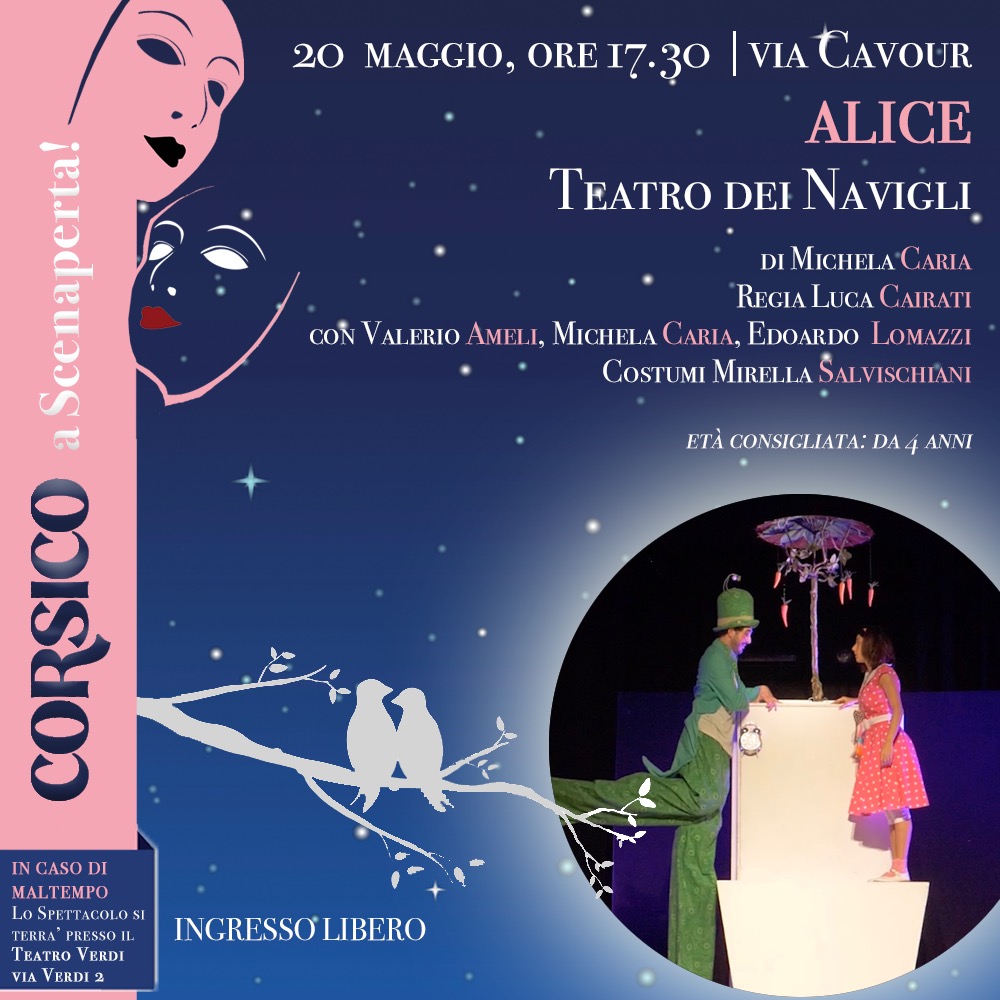 Corsico (17 maggio 2023) – Per la rassegna “Corsico a Scenaperta!”, proposta dall’amministrazione comunale, sabato 20 maggio alle ore 17.30, il Centro Teatro dei Navigli metterà in scena in via Cavour “Alice”, di Michela Caria, per la regia di Luca Cairati, con Valerio Ameli, Michela Caria, Edoardo Lomazzi, costumi di Mirella Salvischiani.