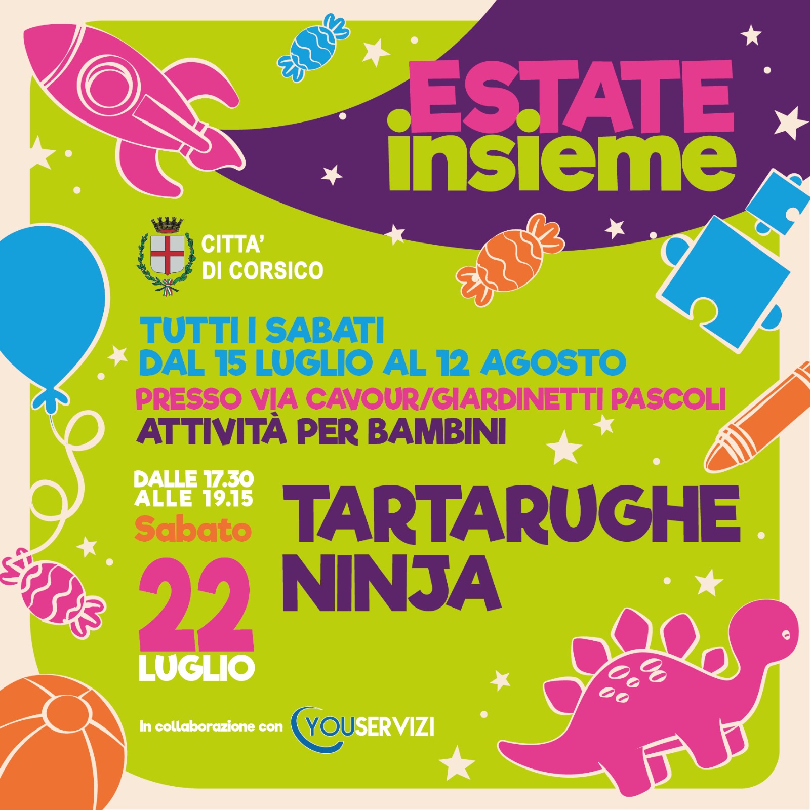 L’animazione per i piccoli si terrà dalle ore 17.30 alle 19.15 tutti i sabati nei giardinetti di via Pascoli (anziché dalle 17.30 alle 19 in via Cavour), mentre l’inizio delle proiezioni all’aperto del “Cinema sotto le stelle” viene posticipato di mezz’ora, alle ore 21.30, tutti i venerdì.