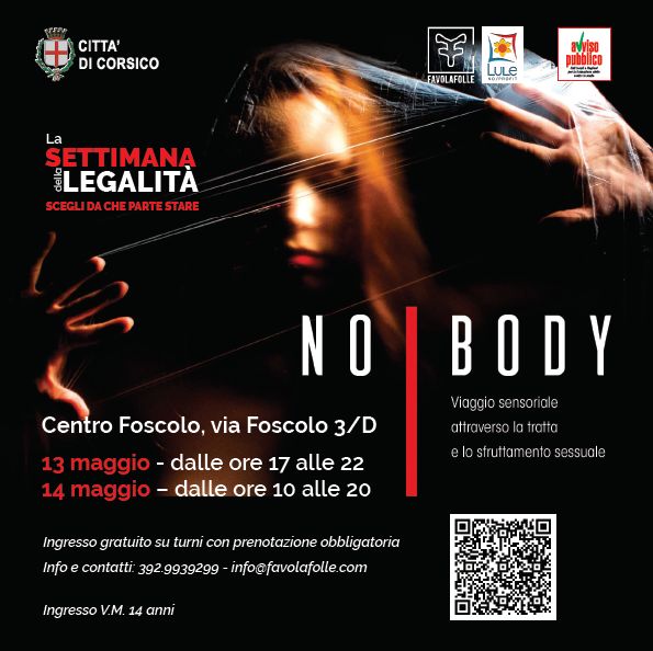 Corsico (12 maggio 2023) – All’interno della “Settimana della legalità”, si ricorda che sono aperte le prenotazioni per “No body”, viaggio sensoriale attraverso la tratta e lo sfruttamento sessuale, che verrà rappresentato sabato 13 maggio dalle ore 17 alle 22 e domenica 14 maggio dalle ore 10 alle 20, al centro di via Foscolo 3/D. L’ingresso è gratuito (vietato ai minori di 14 anni), su turni, con prenotazione obbligatoria telefonando al 392 9939299 o scrivendo alla e-mail info@favolafolle.com.