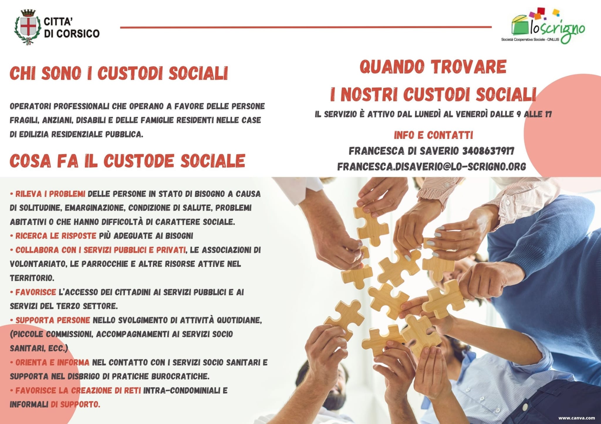 I custodi sociali sono operatori sul territorio che, in ausilio al servizio sociale professionale, supportano i cittadini e aiutano gli stessi ad affrontare situazioni di fragilità di carattere sociale e abitativo mettendo in rete i servizi di prossimità.